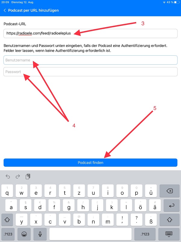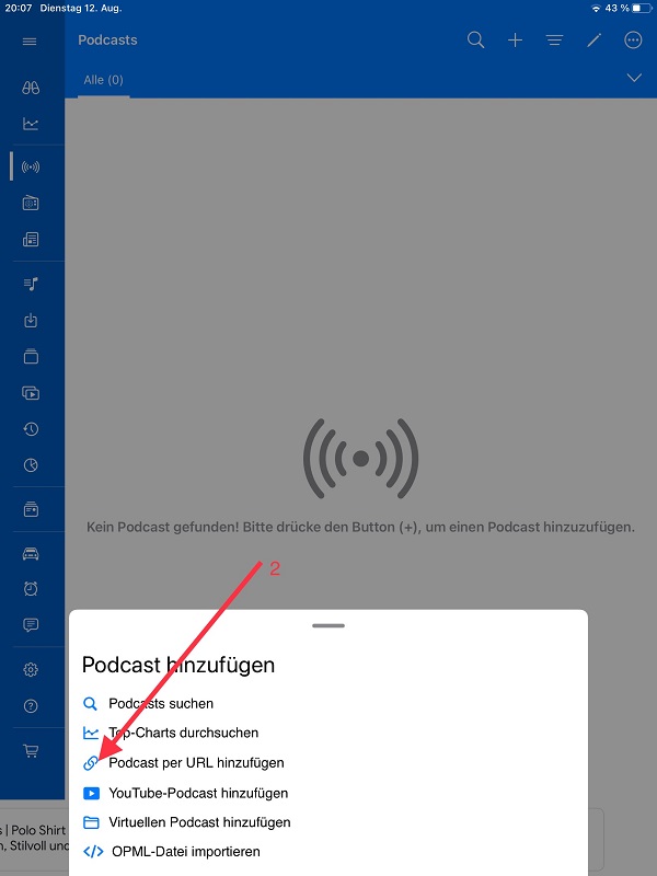 2. Haz click en «Agregar podcast por URL»./ (ENG) Click on ‘Add Podcast by URL»/ (DEUT) Klicke auf ‘Podcast per URL hinzufügen».