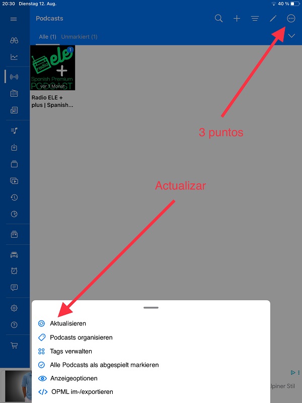 ¡Listo! ¡Ya puedes escuchar todos los episodios del Podcast Premium Radio ELE plus+ en Podcast Republic! Si no puedes ver un nuevo episodio, haz click en (…) y después en «actualizar»/ (ENG) Done! You can now listen to all episodes of the Premium Radio ELE plus+ Podcast on Podcast Republic! If you cannot see a new episode, click on (…) and then «refresh.»/(DEUT) Fertig! Du kannst jetzt alle Episoden des Premium Radio ELE plus+ auf Podcast Republic hören! Wenn du eine neue Episode nicht sehen kannst, klicke auf (…) und dann auf «Aktualisieren.»